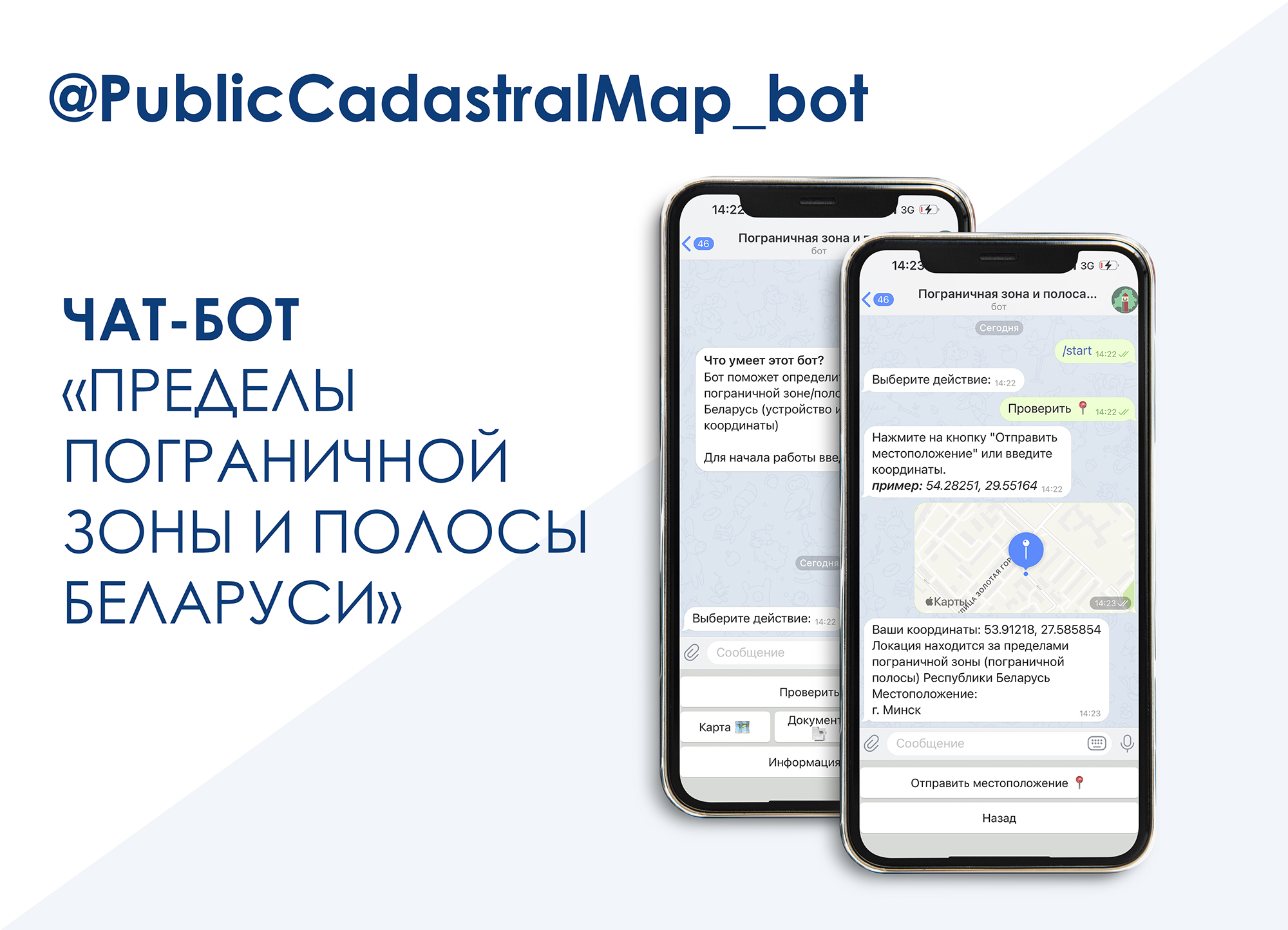 В ответ чат-бот сообщает о нахождении в пределах или за пределами пограничной зоны (полосы), а также об административно-территориальной единице, в которой находится точка с заданными координатами в соответствии с данными единого государственного реестра административно-территориальных и территориальных единиц государственного земельного кадастра Беларуси.