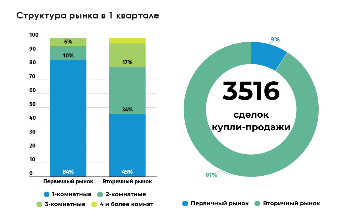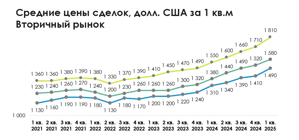 За первый квартал больше всего прибавил квадратный метр в однокомнатных квартирах на вторичном рынке (+100 долларов США в эквиваленте), установив ценовой рекорд за последние 10 лет – 1 810 долларов США в эквиваленте. Двух- и трехкомнатные квартиры подорожали на 60 и 80 долларов США в эквиваленте на квадратном метре соответственно.