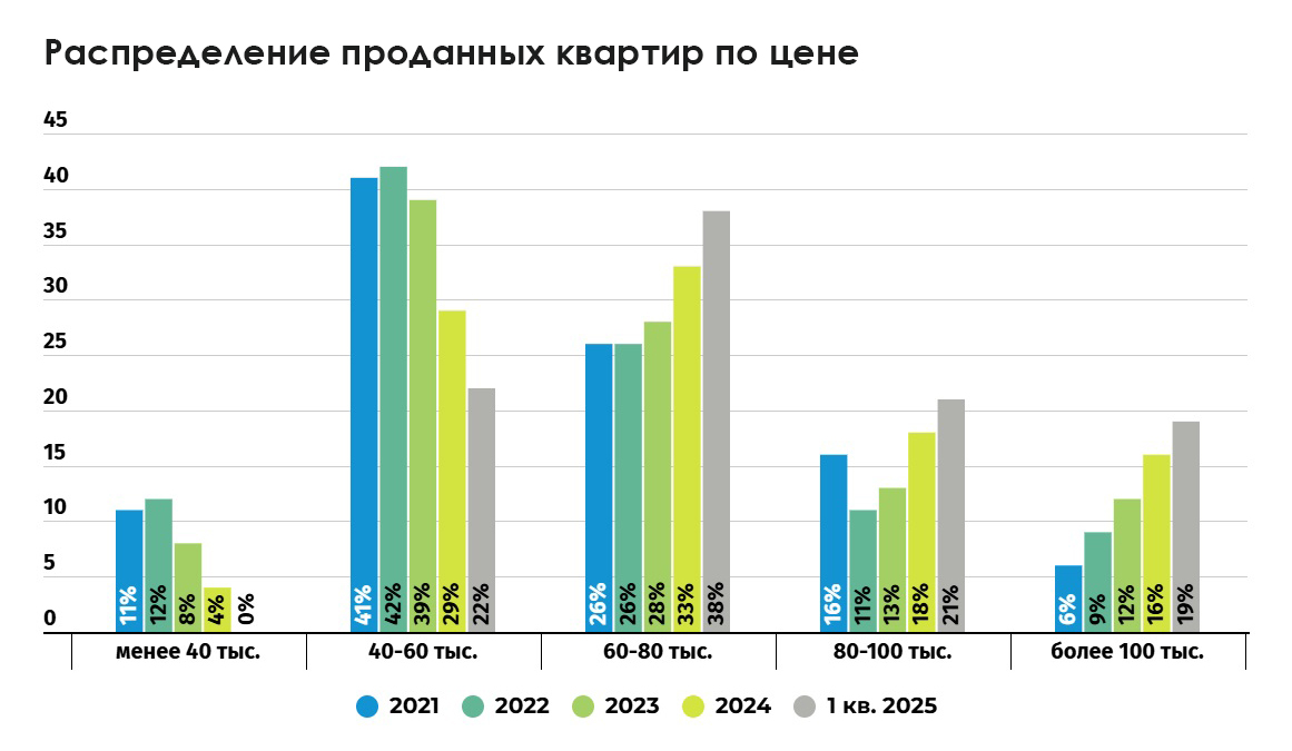 Выросла также доля квартир с ценой более 100 тысяч долларов США в эквиваленте, а в наиболее популярный диапазон от 60 до 80 тысяч долларов США в эквиваленте попали 38% сделок, что на 5 процентных пунктов больше показателя 2024 года.
