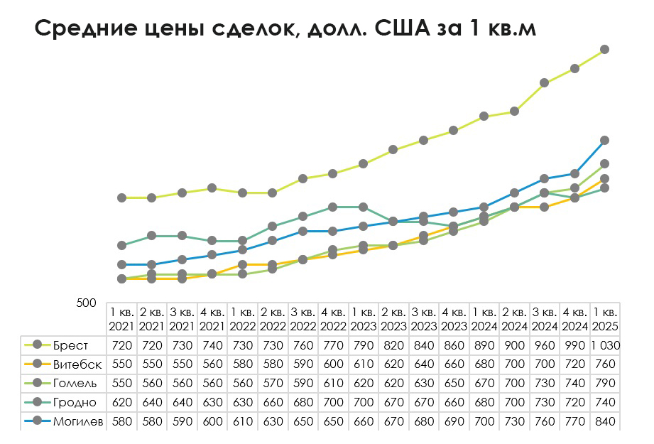 Средняя цена сделок по итогам 1 квартала 2025 года к 4 кварталу 2024 года увеличились во всех областных центрах. В Бресте она перешагнула отметку 1 тыс. долларов США в эквиваленте, а максимальный рост зафиксирован в Могилеве.