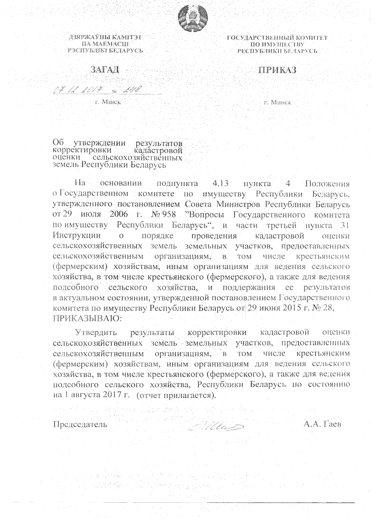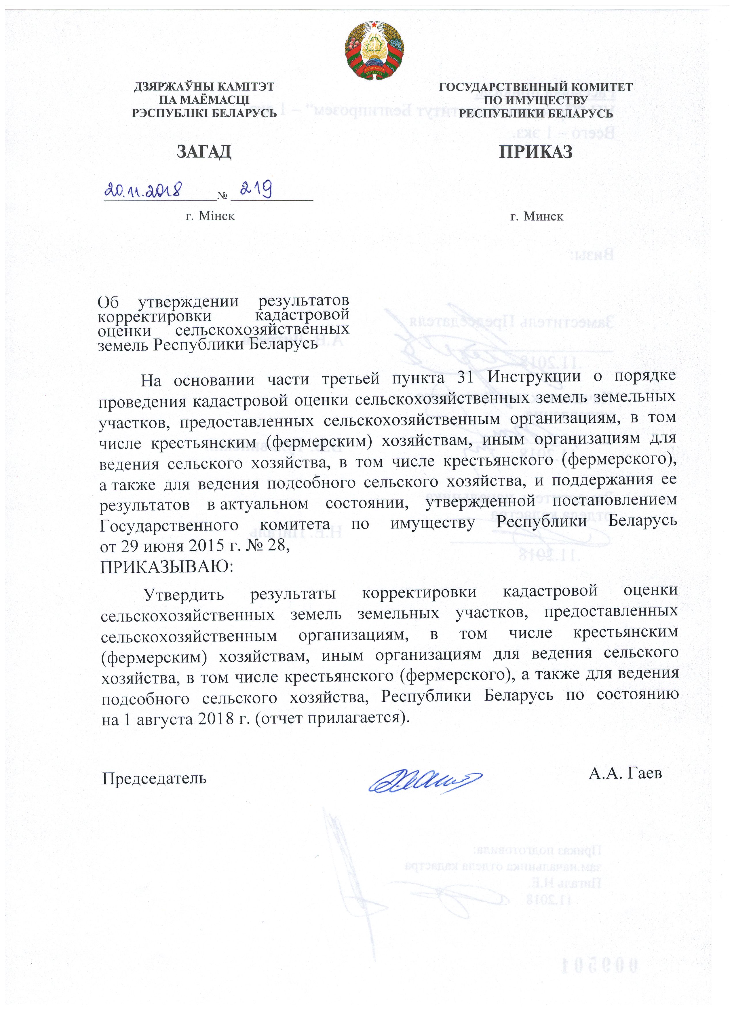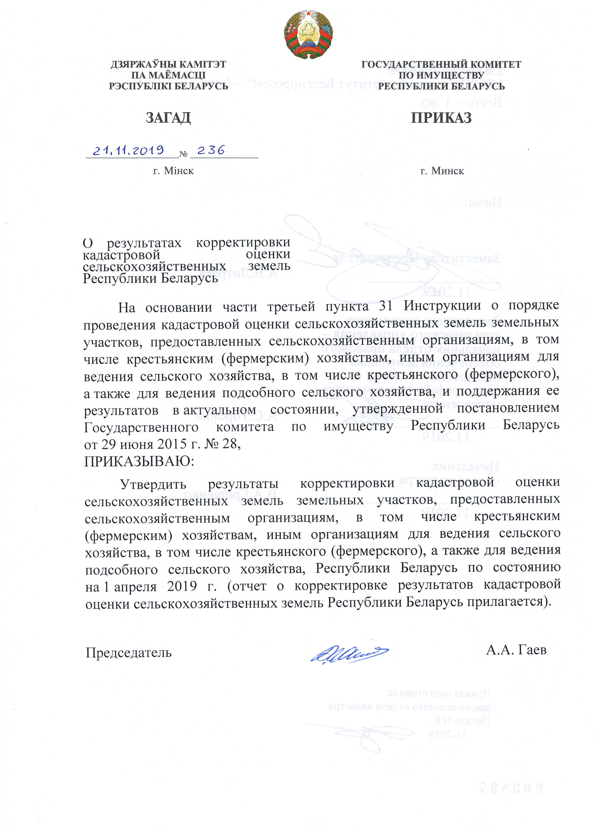 Результаты корректировки кадастровой оценки сельскохозяйственных земель Республики Беларусь , утвержденные приказом Государственного комитета по имуществу Республики Беларусь от 21 ноября 2019 г. № 236 в редакции приказа Государственного комитета по имуществу Республики Беларусь от 9 марта 2020 г. № 34